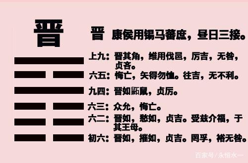晋卦的初爻是“晋如,摧如,贞吉。罔孚裕,无咎”,代表的是前进冲锋的勇气和决心,但也需要时刻警惕贸然行动带来的后果。第二爻是“晋如愁如,贞吉。受兹介福于其王母”,意味着要抑制内心的情感,重视自我调整与调解,才能获得好的机会。第三爻是“众允,悔亡”,它代表着人际关系的和谐,并提醒我们注意团体的力量。第四爻是“汲无丧,出门无祸,亨”,象征着事业的进展与成功,但也需要注重出门在外的安全。第五爻是“引号,实临,无咎,享于豕,则象以伐,吉之;不可户瓮,永贞吉”,强调行动的准确和精彩,但也需要注意谨慎行事,以避免无谓的损失。最终爻是“晋如碩鼠,贞厉”。它警告我们,当成功变成过于自信的行动时,就容易陷入危机之中。