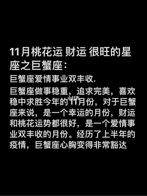 主动:主动:巨蟹座往往被动,不善于表达感情。只有积极主动,多参与社交活动,才能增加与异性接触的机会,提高桃花运。