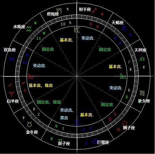 以上是以十二星座为代表的十二宫。每个人的星盘都是的,不同星座在不同宫位的特点和表现形式也不同。