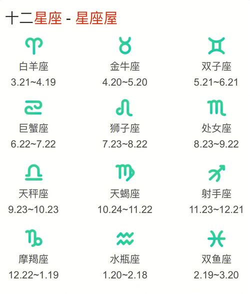 1. 白羊座(3月21日) - 4月19日)白羊座是火象星座之一,热情大方,喜欢冲锋陷阵,领导力强。白羊座出生于3月21日至4月19日。这段时间出生的人通常热情能干,勇于冒险,不怕困难。