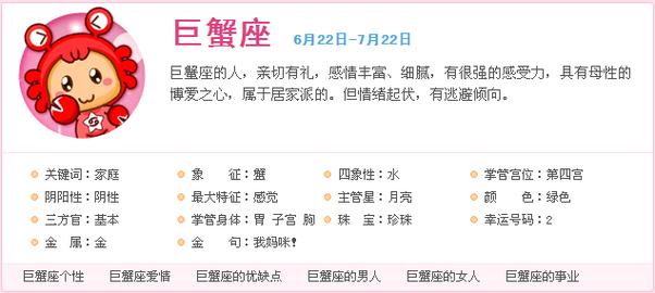 巨蟹座通常有爱心,乐于善待。他们很情绪化,有时候会让人觉得莫名其妙。他们忠于朋友和家人。他们非常重视家庭。他们是家庭的守护者,充满了温柔的气质。意志力强,体贴节俭。