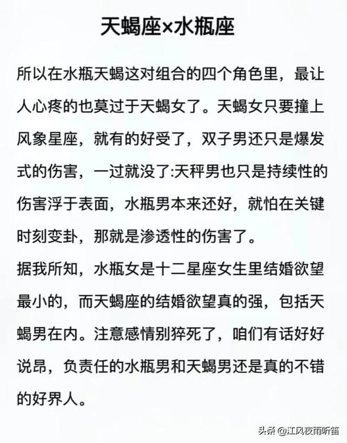 水瓶座和天蝎座的配对指数1星座配对指数:★★★☆