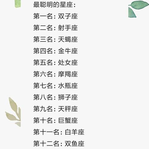 12个星座中最聪明的排名是根据不同特征和能力的综合表现来确定的。每个人的聪明口袋不仅是基于星座,还有许多个人因素。 能够根据自己的实际情况进行自我发掘和提升,成为解决问题、面对未来的聪明人才。