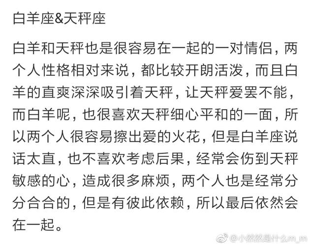 在感情中,两个人之间也有可能出现一些矛盾和问题。比如,白羊女可能会对天秤男的怕事和拖延感到不满,认为他们对自己应该有更强的主见和选择能力。而天秤男则可能会对白羊女的粗犷和直接方式感到不适应,需要一种更圆滑、柔软和适度的方式来处理一些问题。