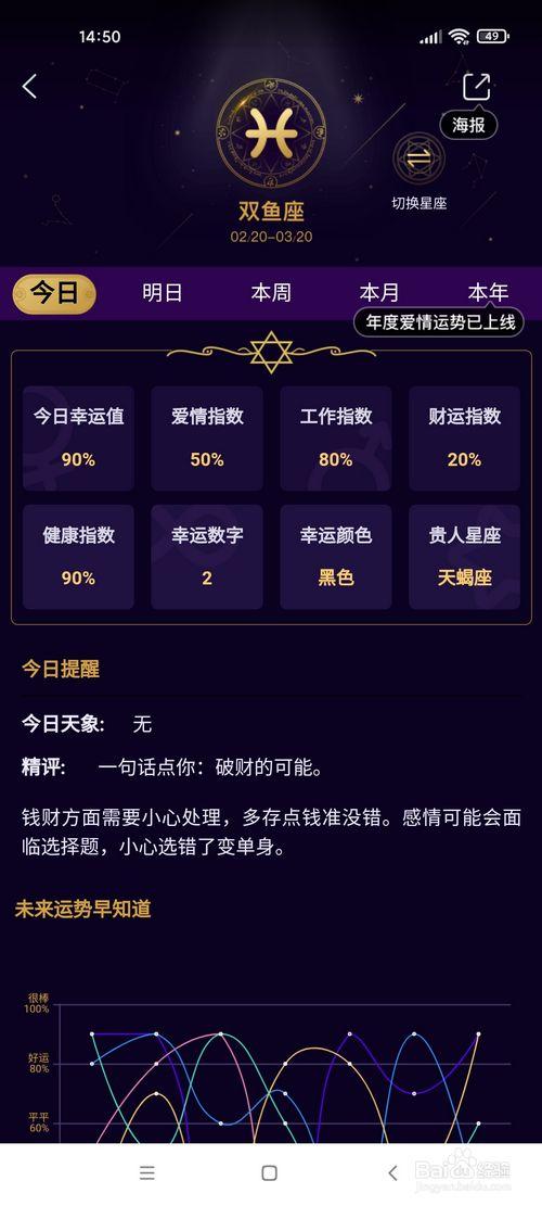 新浪星座运势查询内容新浪星座财富查询的内容包括学术、工作场所、人际关系、健康等方面。对于每个星座,新浪提供了每天、本周、本月和今年的财富预测。每个预测都包括一般描述、过去和现在的情况,以及对未来的预测。此外,它还将提供一些关于星座的轶事、幸运的数字和幸运的东西,这些都需要永远记住。