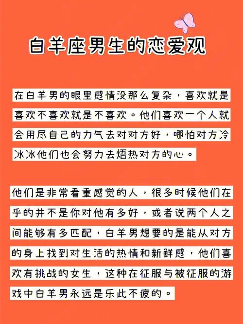 白羊座男人对感情的态度分析这个星座的男人很幼稚,他的守护星是火星,因为白羊座是春天的星座,所以性格开朗,热情,积极,但缺乏仔细考虑,往往只有三分钟的热量,通常白羊座爱一见钟情,一旦他喜欢一个女孩,他会盯着猎物,必须放弃。