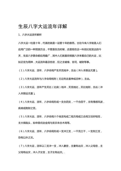 什么是大运流年大运流年是指在大运周期中,每个年份所对应的地支、天干的组合。大运是人生命运中很重要的一个篇章,在某一个时间段内,根据八字的阴阳五行特性,特别是与大运有关的地支、天干组合,可以推断出当时个人生活、事业、健康、财运等方面的状况。配合其他相关的占卜方法,可以为人生指引方向,以便更好地面对未来的挑战。