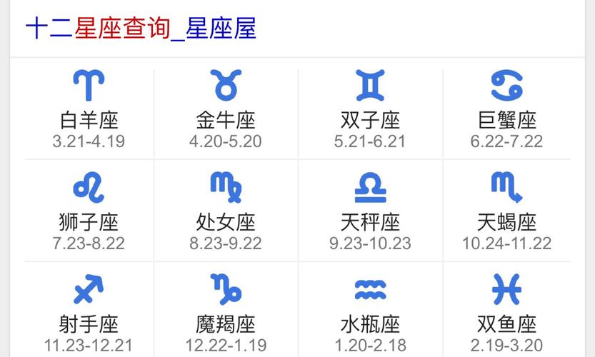 搜狐星座>>星座查询白羊座(3.21-4.20)金牛座(4.21-5.21)双子座(5.22-6.21)巨蟹座(6.22-7.22)狮子座(7.23-8.23)处女座(8.24-9.23)天秤座(9.24-10.23)天蝎座(10.24-11.22)