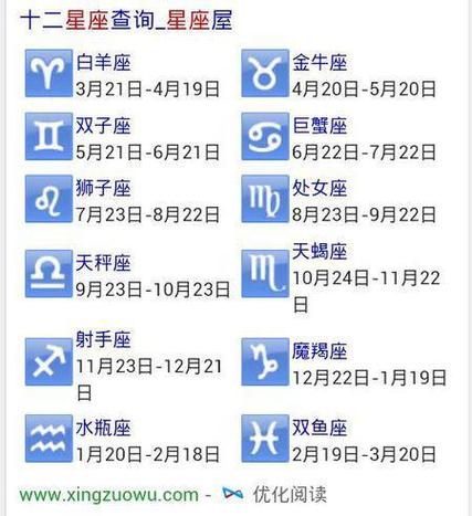 想知道自己是什么星座的人,准备阳历生日,对比一下!白羊座:3月21日至4月20日;金牛座:4月21日至5月21日;双子座:5月日至6月21日;巨蟹座:6月日至7月日;狮子:7月23日至8月23日;处女:8月24日至9月23日;天秤座:9月24日至10月23日;天蝎座:10月24日至11月日;射手:11月23日至12月21日;摩羯座:12月日至1月20日;水瓶座:1月21日至2月19日;双鱼座:2月20日至3月20日。看完之后,很快就能知道自己的星座了。