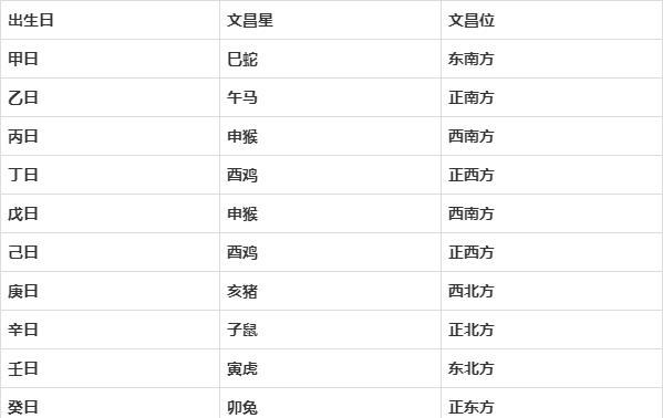 也就是说,甲以丙火为食神,食神丙火的临官位在巳,故甲天干以巳为文昌。乙以丁为食神,食神丁临官在午,故乙以午为文昌,以此类推。总结起来,甲日见己为文昌,乙日见午为文昌,丙见申,丁见酉,戊见申,己见酉,庚见亥,辛见子,壬见寅,癸见亥,均为文昌贵人。另外还有一种查询方法,篇幅问题以后有机会再谈。