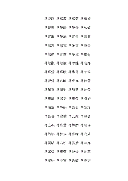 5、马冉依、马馨惠、马以忆、马婉如、马依丝、马依紫、马雅雅、马以、马菱芹、马语月、马向卿、马灵蕊、马采芷、马迎蝶、马颖秋、马琼楠、马采莲、马梓凝、马辰露、马馨语、马珠春、马黛晓、马婉迎、马优天。